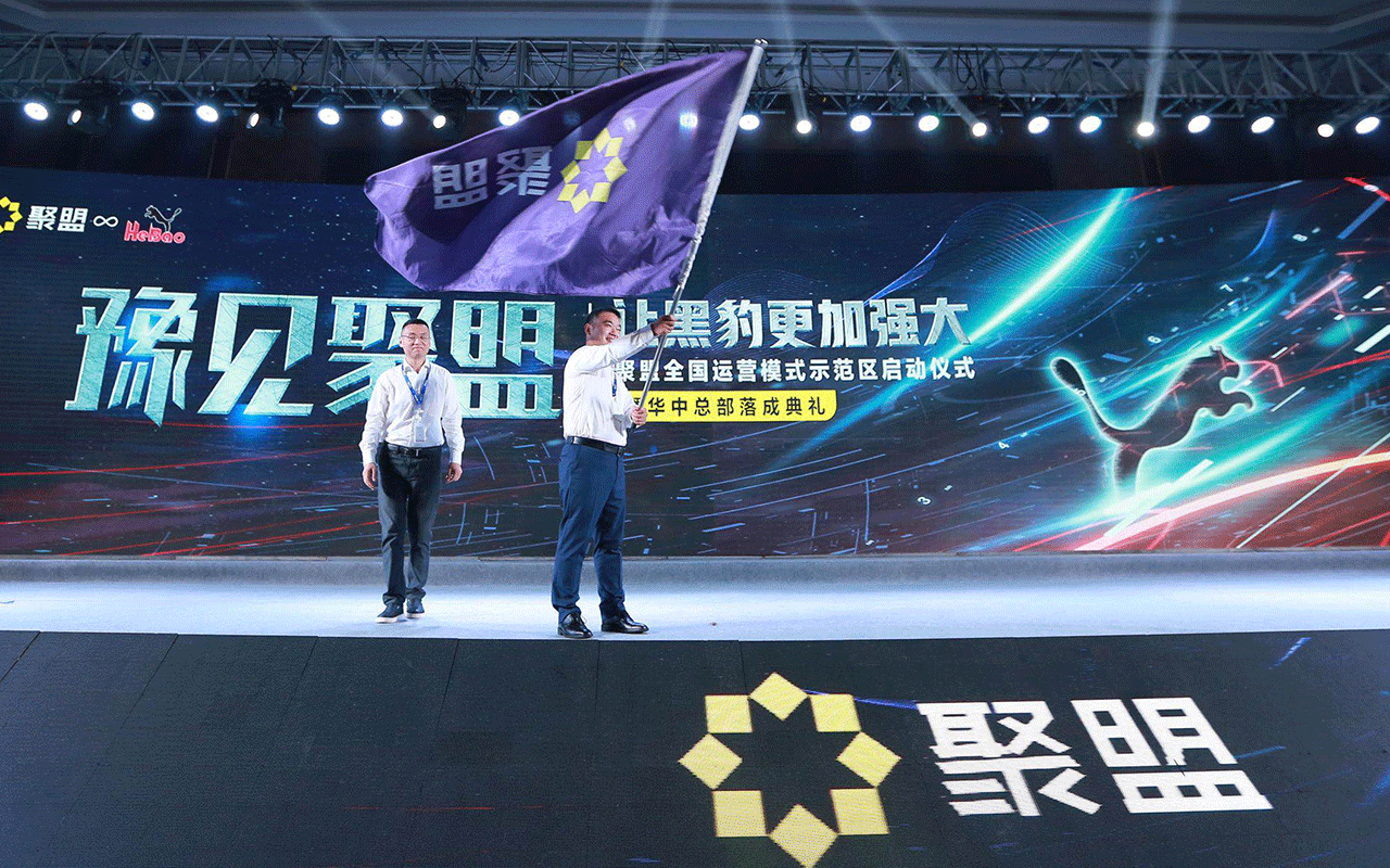 在發布會現場,張玉晶將聚盟的旗子授予楊光,標志著聚盟全國運營模式示范區啟動,聚盟華中總部正式落成。