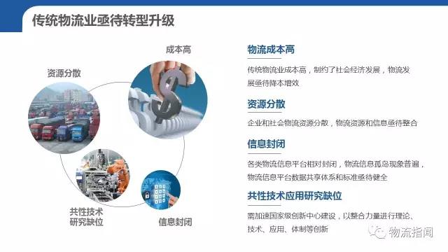 傳統的物流業成本高,制約了社會經濟的發展。物流發展亟待降本增效;企業和社會物流資源分散,物流資源和信息亟待整合。各類物流信息平臺相對封閉,物流信息孤島現象普遍,物流信息平臺數據共享體系和標準亟待健全。共性技術應用研究缺位,急需加速國家級創新中心建設,以整合力量進行理論、技術、應用、體制等創新。